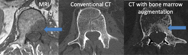 We have developed  post-processing techniques to enhance detection of bone marrow lesions and also  soft tissue lesions using conventional single-energy CT data. For bone marrow lesion  detection, a post-processing algorithm was created to enhance the soft tissue  components of bone.  The technique has been preliminarily tested in  clinical cases of MRI proven, CT-occult bone marrow lesions of the lumbar  spine, demonstrating detection of lesions in 8 of 11 CT-occult lesions. For  soft tissue lesion detection, a fluid-sensitive look-up table was created to  mimic STIR MRI imaging with single-energy CT data.  A steak model has been  evaluated with blinded independent reading from 4 musculoskeletal radiologists  demonstrating the detectability of injected lesions in skeletal muscle,  demonstrating excellent accuracy of lesion detection using this technique.