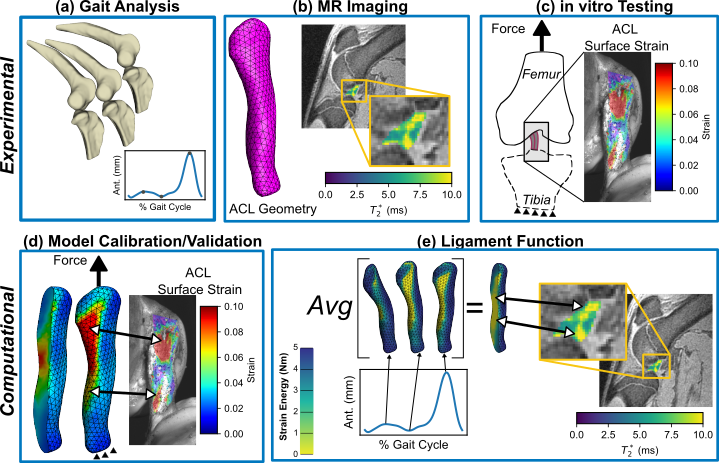 Anterior cruciate ligament (ACL) tears are a common injury among athletes, and patients often desire to return to pre-injury activities following ACL reconstruction surgery. For those that do return, up to 30% will retear their graft or injure their contralateral ACL. Patients generally return to sports between six to nine months following surgery; however, studies have shown that ACL grafts mature throughout the first two post-operative years. The amount and organization of collagen within the ACL graft indicates a more mature ligament and has been shown to impact its biomechanical function. Collagen organization can be noninvasively evaluated using quantitative MR imaging and is thought to be related to biomechanical function. Relating the amount and distribution of organized collagen within healing ACLs or grafts to its functional biomechanics cannot be achieved clinically due to the nature of invasive measures. A computational model that pairs non-invasive estimates of collagen organization with its direct underlying biomechanical measures would provide a means to evaluate the effect of organized collagen distribution on ligament biomechanics non-invasively. The purpose of this project is to build subject-specific computational ACL models to test if, and to what extent, organized collagen distribution affects ligament biomechanical behavior using an established minipig model of ACL surgery. Experimental in vitro test data will be collected to calibrate subject-specific ACL models and validate the model’s strain predictions. The calibrated models will subsequently be used to evaluate the relation between areas of high strain energy during gait and T2* relaxation time distribution. At study completion we will have generated insight into the impact that accounting for organized collagen distribution has on MR T2*-predicted ACL biomechanical behavior and function.