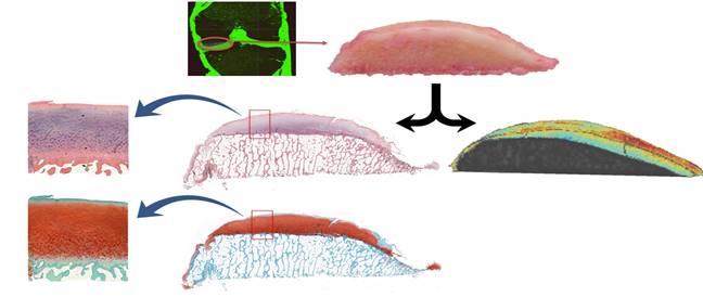 This  project is a multidisciplinary approach, building upon medical imaging and  histopathological analyses for the evaluation/categorization of early to late  stage osteoarthritis (OA). It is the goal of the project to further develop  clinical imaging methodologies for early detection of OA, such that  preventative measures can be taken at early stages of the disease. We integrate  clinical 7T and 3T Magnetic Resonance (MR) systems, in vitro preclinical 7T MR, and micro computed tomography (CT) in  providing quantitative evaluation of cartilage composition. Additionally  histopathological assessment by different techniques including immune-staining  will allow in depth characterization of cartilage at different stages of OA.
