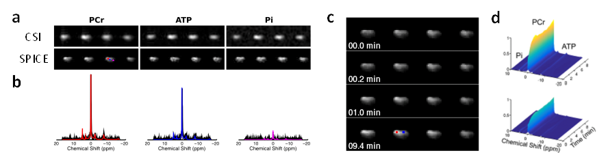 phosphorus-31  (31P) MRSI offers direct, in vivo quantification of high-energy phosphate  metabolites such as adenosine triphosphate (ATP) and phosphocreatine (PCr). Of  particular interest, monitoring the depletion and resynthesis of PCr during an  exercise-recovery protocol by dynamic 31P-MRSI allows the assessment  of mitochondrial oxidative capacity (MOC) in skeletal muscle.  However, because of the extremely low  concentrations of phosphate metabolites, current 31P-MRSI methods require  prohibitively long acquisition time to achieve adequate signal-to-noise ratio  (SNR), and hence are not practical for routine clinical use. In this study, we  aim to develop and translate fast and high-resolution 31P MRSI at 7 Tesla using  a novel subspace-based approach called SPICE (SPectroscopic Imaging by  spatiospectral CorrElation). Such techniques will be powerful non-invasive  tools for mitochondrial function evaluation.