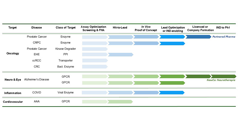 Our research requires a multi-disciplinary team focus which includes medicinal chemistry, biochemistry, structural biology, chemical biology, cell biology, pharmacology, and resources and expertise in toxicology and drug metabolism. Through bringing together highly skilled teams of scientists, prudent application of resources and go/no-go milestones, we interrogate both the chemical and biological space of a given preclinical hypothesis utilizing state of the art technologies to understand target engagement as well as off-target pharmacology. These efforts afford high quality tool compounds and clinical candidates.
